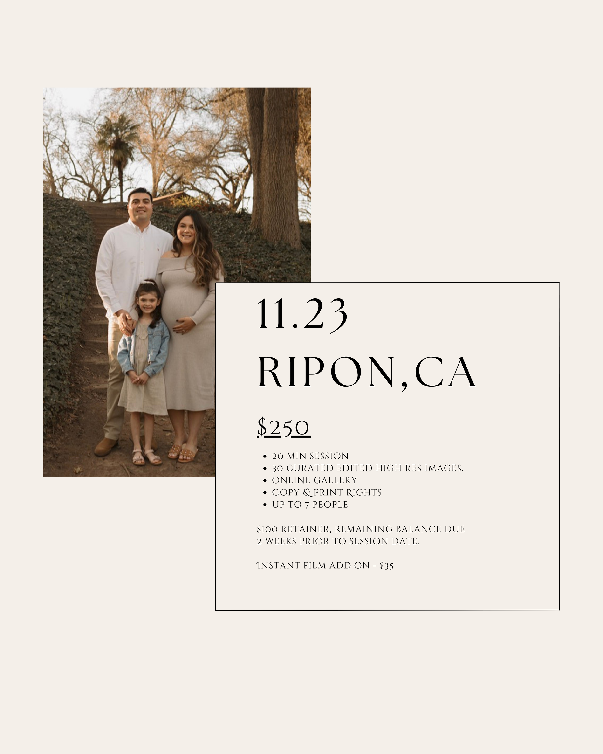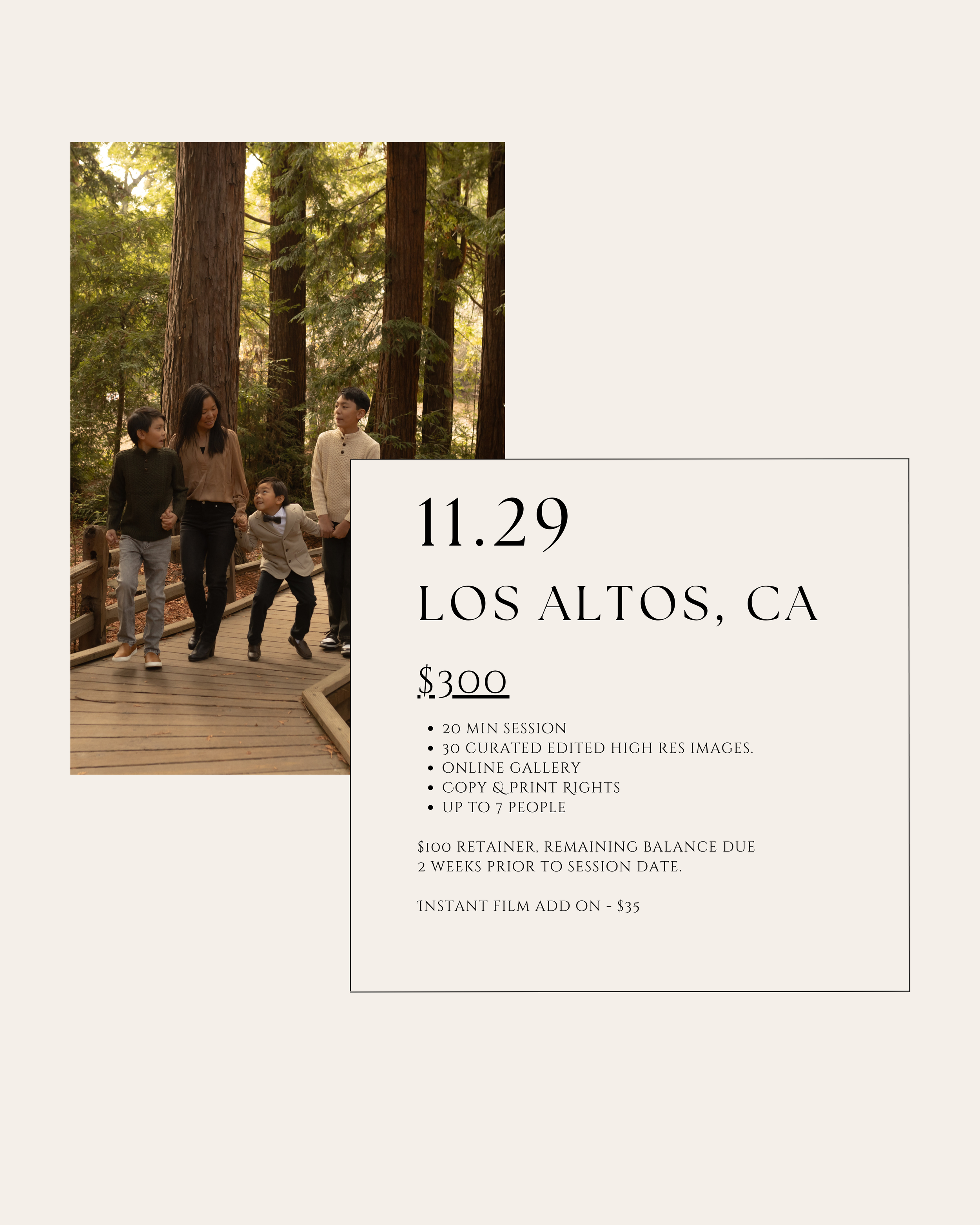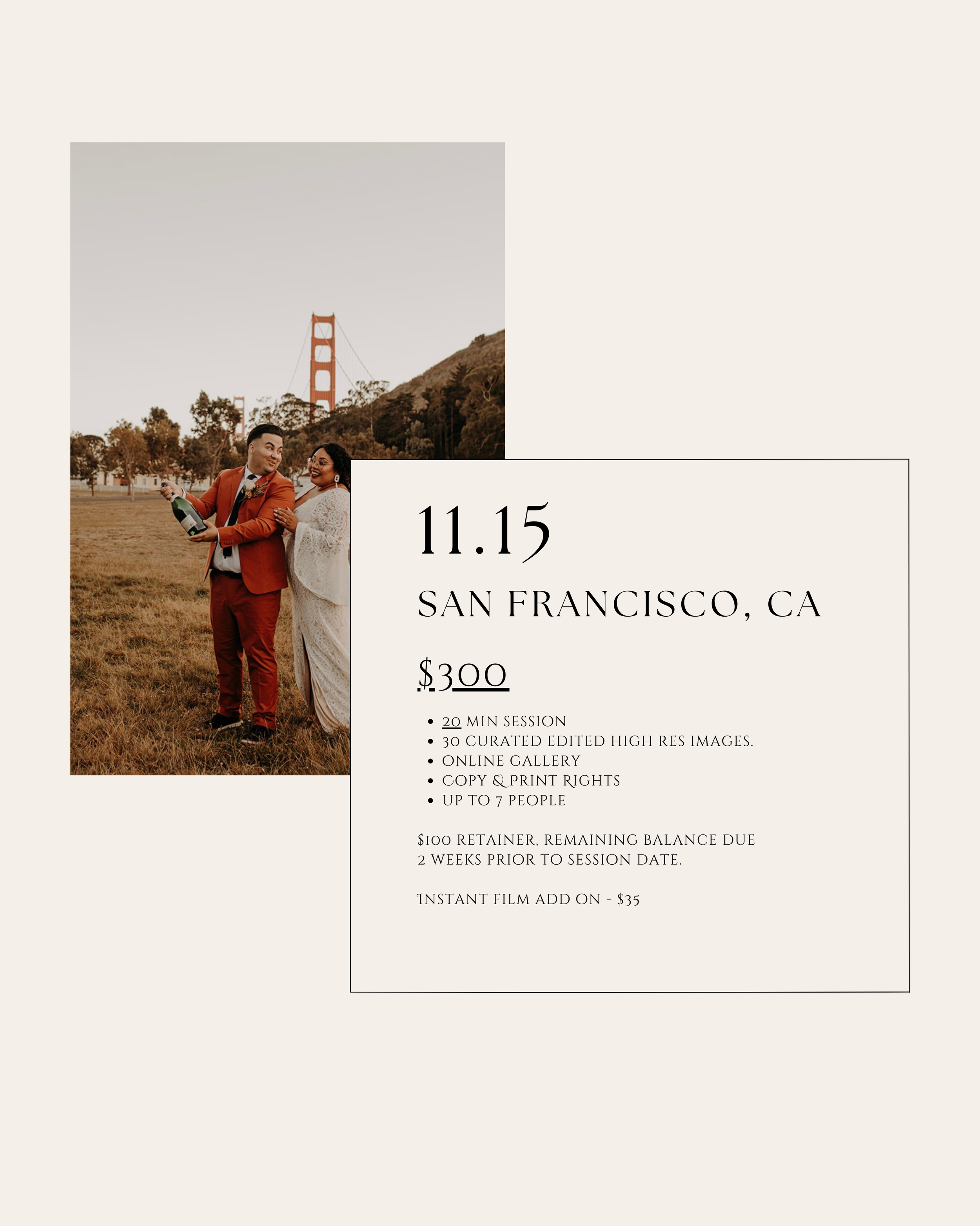 You are always welcome to book a full session with full benefits in selecting a date, time, and location that fit best for you! For more details, click here